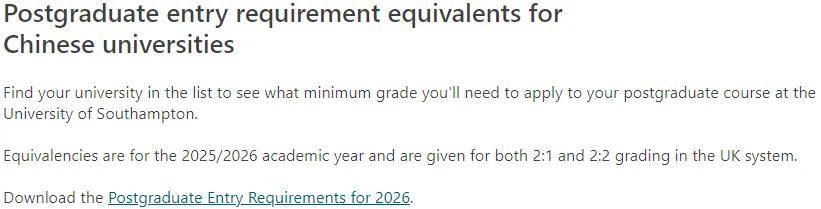 学校发布了全部的院校认可名单以及所在等级。大家在申请南安普顿大学前,需要先确认自己的本科院校是否在大学的认可名单中,再来确认具体分数要求?