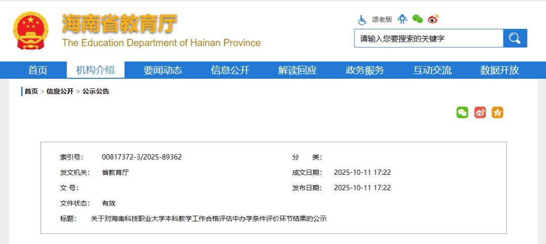 10月11日,海南省教育厅发布 关于对海南科技职业大学本科教学工作合格评估中办学条件评价环节结果的公示。具体内容如下: