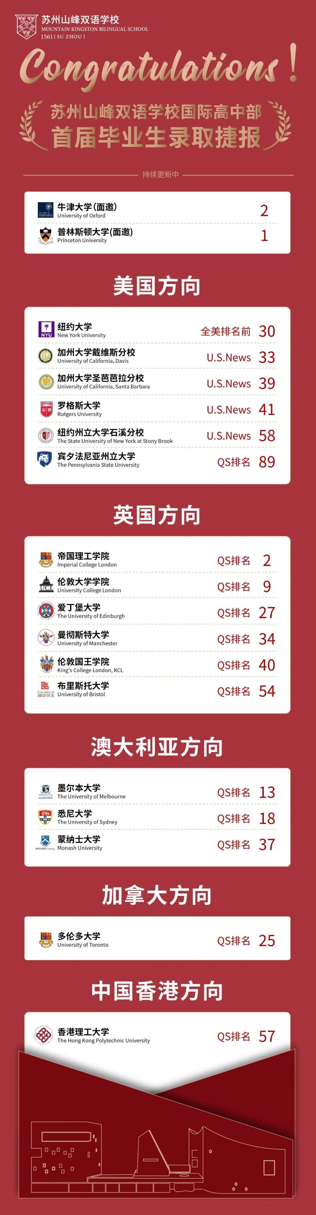 今年迎来首届毕业生的苏州山峰双语学校,人均斩获5枚全球高校offer,涵盖纽约大学、帝国理工大学、伦敦大学学院、香港理工大学等。其中,70%学生获录取全球TOP10大学,80%+学生获录取全球TOP20大学。
