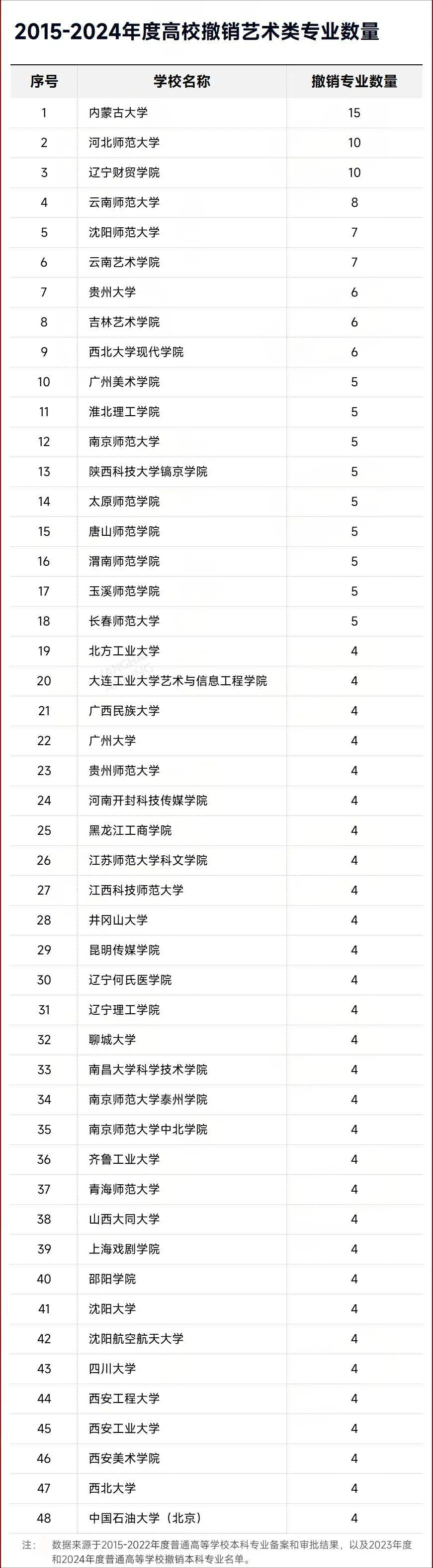 单个高校中,内蒙古大学撤销15个艺术类专业,河北师范大学、辽宁财贸学院各撤销10个,调整力度可见一斑。
