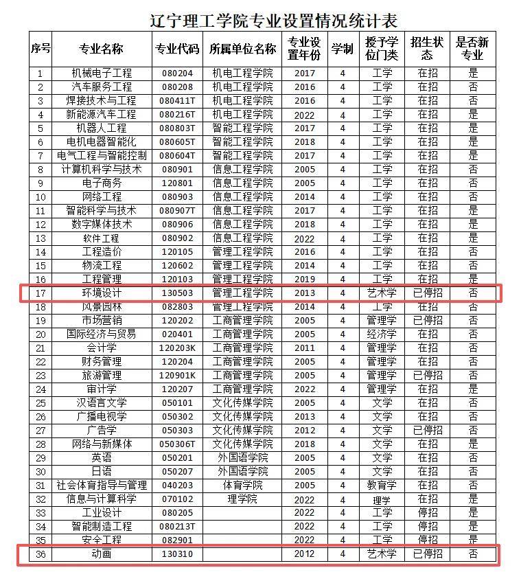 同样全面停招艺术学的,还有辽宁理工学院。依据该校2023年发布的专业设置情况统计表,环境设计、动画2个艺术类专业已停止招生。