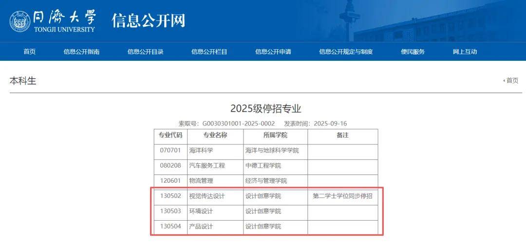 9月16日,同济大学信息公开网发布学校2025级本科停招专业名单,分别是:海洋科学、汽车服务工程、物流管理、视觉传达设计(第二学士学位同步停招)、环境设计、产品设计。