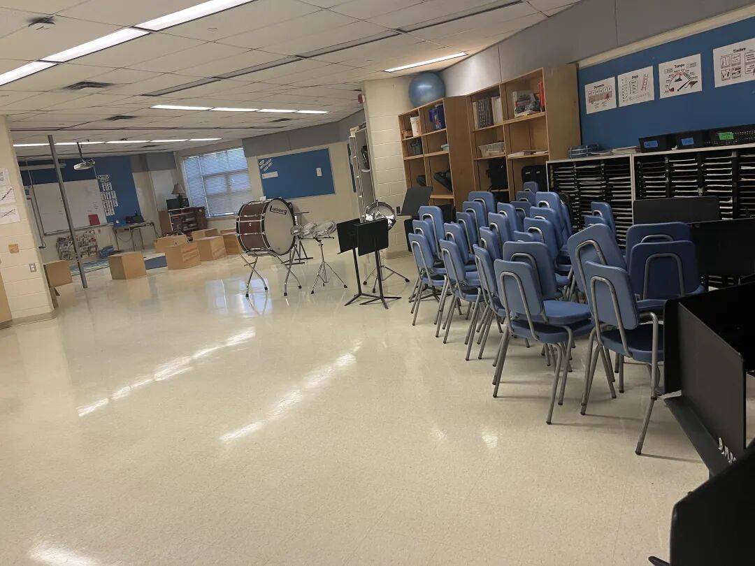 我在各个小组间巡视,提供帮助。有的学生比我知道得多——比如小号的润滑油摆放在音乐室的什么位置——我刚来这所学校,对很多细节还不了解——在大家的共同努力下,第一节乐器课进展非常顺利。