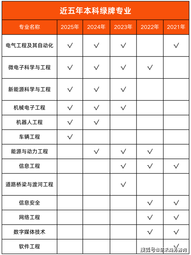 从近五年本科绿牌专业榜单来看,电气工程及其自动化、微电子科学与工程均上榜4次;机械电子工程、能源与动力工程、信息工程均上榜3次;车辆工程为首次上榜。