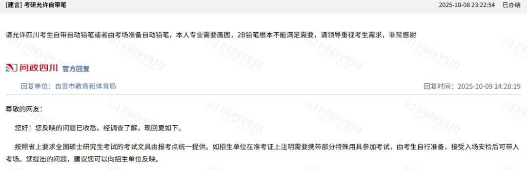 记者注意到,对于网友的相关建议,10月9日,自贡教体局也做了回复:按照省上要求全国硕士研究生考试的考试文具由报考点统一提供。如招生单位在准考证上注明需要携带部分特殊用具参加考试,由考生自行准备,接受入场安检后可带入考场。您提出的问题,建议您可以向招生单位反映。