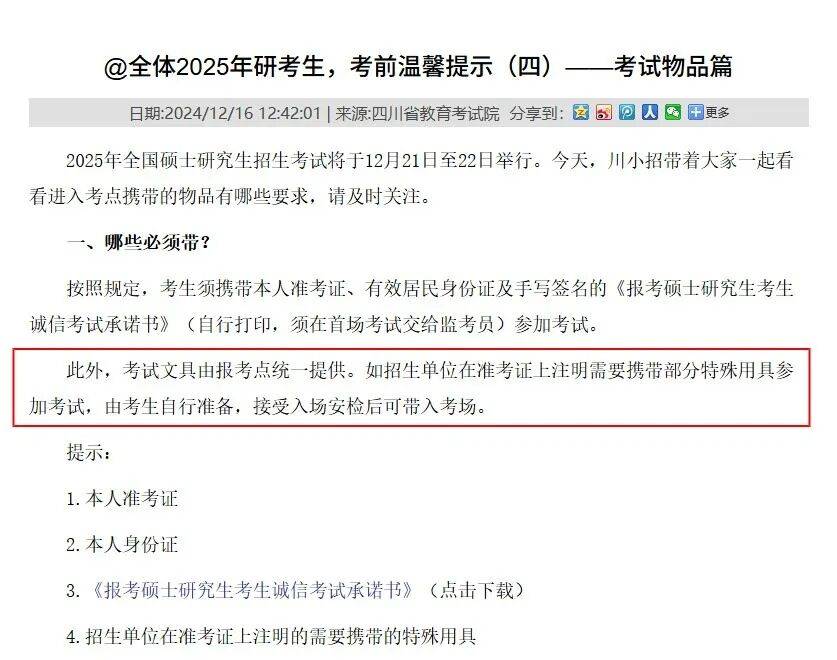 潇湘晨报记者注意到,在去年(2025)考研前,四川教育考试院曾发布考试物品提示:考试文具由报考点统一提供。如招生单位在准考证上注明需要携带部分特殊用具参加考试,由考生自行准备,接受入场安检后可带入考场。