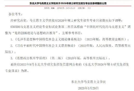 26年科目二名称从之前的 807中国化时代化的马克思主义 改为 807党的创新理论与思想政治教育