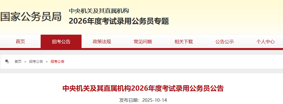 考生可于10月15日8:00至10月24日18:00期间登录“中央机关及其直属机构2026年度考试录用公务员专题网站”(http://bm.scs.gov.cn/kl2026)进行网上报名,公共科目笔试将于11月30日在全国各直辖市、省会城市、自治区首府和部分城市同时举行。
