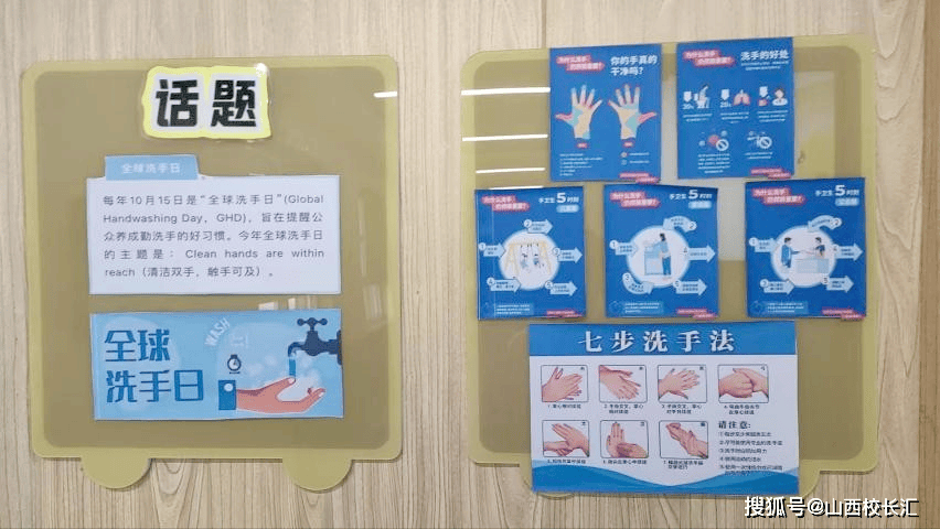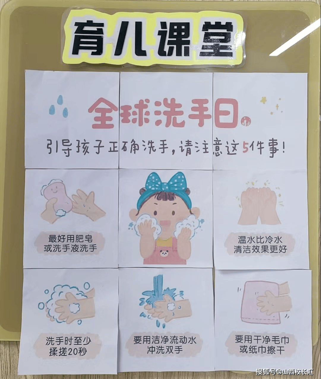 活动前期,幼儿园利用宣传栏打造了 “全球洗手日专题宣传区”,通过生动的卡通图片、简洁的文字说明,向幼儿和家长介绍全球洗手日的起源、意义以及洗手对预防疾病的重要性。