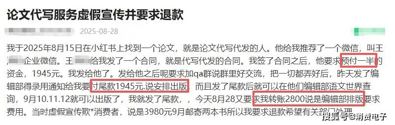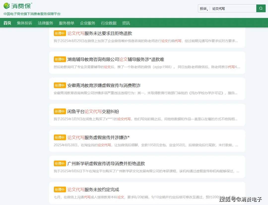 一边是用户花高价找代写服务,一边是中间商赚取绝大部分利益,通过低价转包、AI批量输出的文章往往不达标,不少用户在消费保平台投诉“论文代写”相关机构虚假宣传、服务差、退款难。
