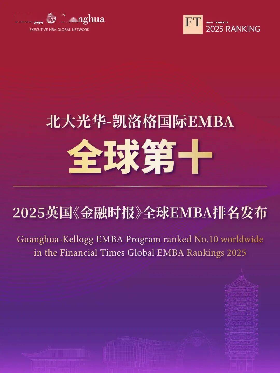 10月13日,英国《金融时报》(Financial Times)发布2025年全球EMBA项目百强榜单,由北京大学光华管理学院与美国西北大学凯洛格管理学院联合打造的光华-凯洛格国际EMBA项目(Guanghua-Kellogg EMBA Program)全球排名提升至第10位,较去年首次上榜的第12位再次实现突破。