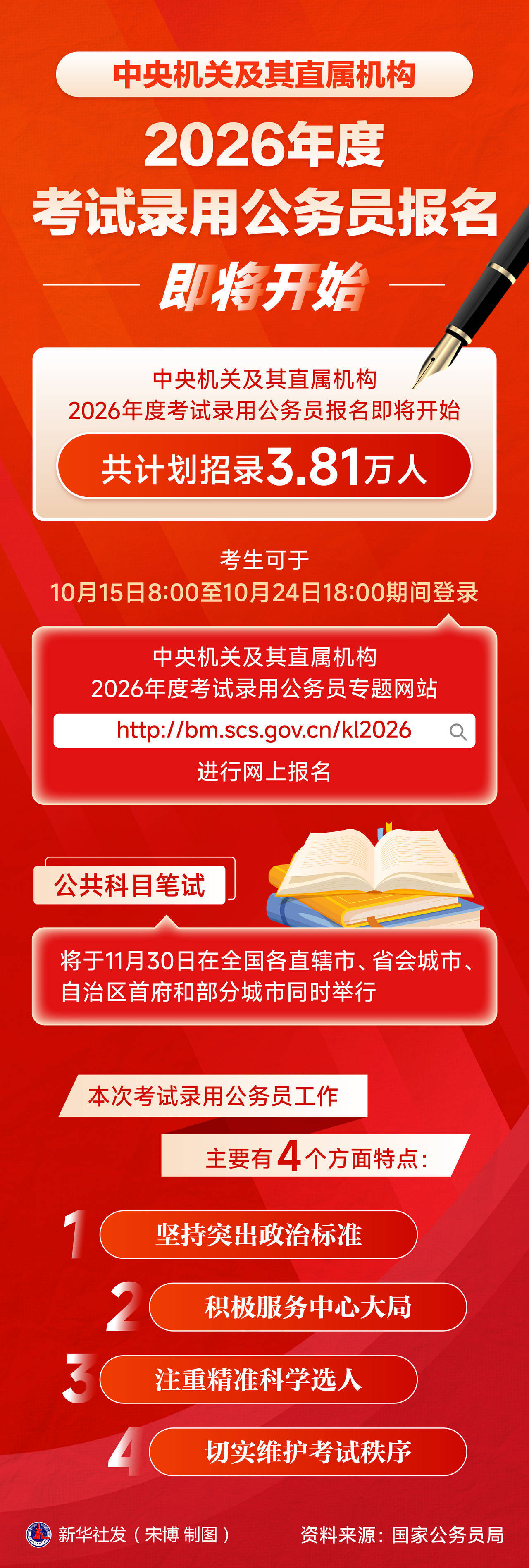 10月14日,国家公务员局发布《中央机关及其直属机构2026年度考试录用公务员公告》,明确报考者年龄一般为18周岁以上、38周岁以下,对于2026年应届硕士、博士研究生,更放宽到43周岁以下。