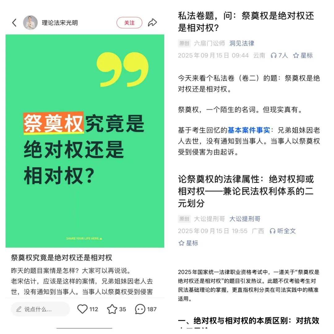 2025年9月13日,在2025年法考中,该案例被客观题(卷一)改编采用,随即在各大网络平台引起了关于“祭奠权究竟是绝对权还是相对权”的广泛关注和热烈讨论,不少专家学者、网络大V发帖发文参与讨论与解析。