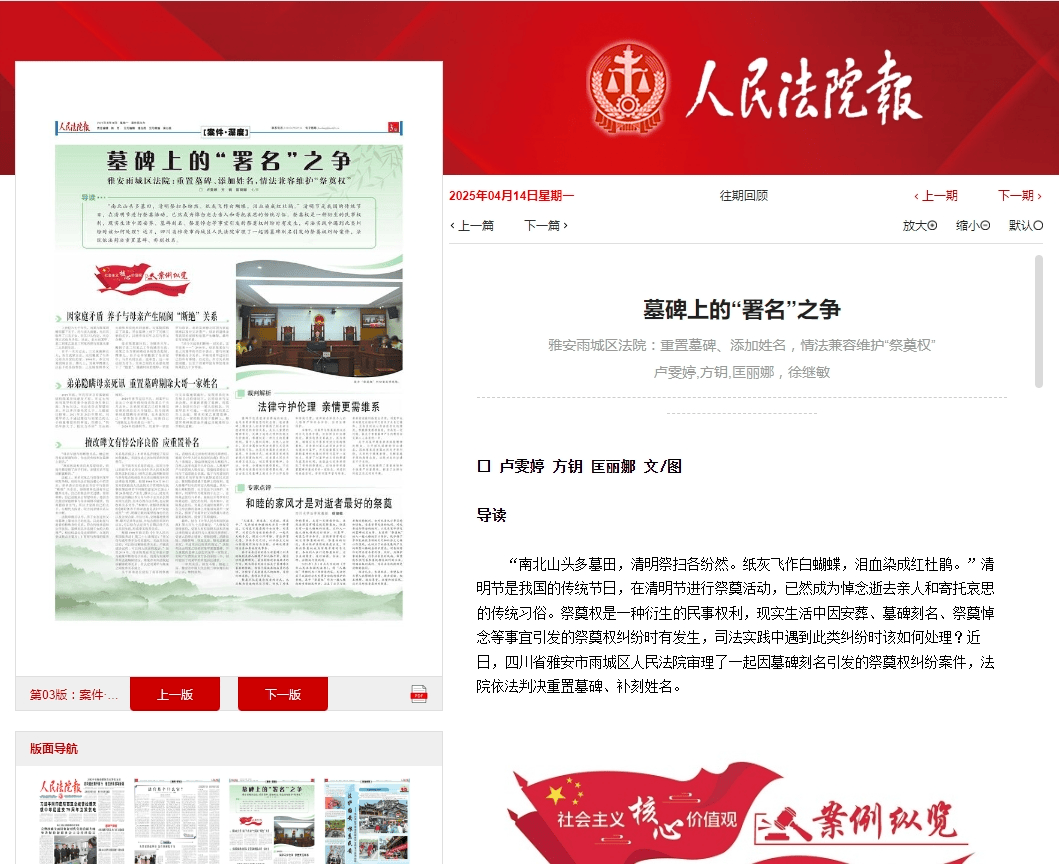 2025年4月14日,《人民法院报》三版刊发了深度报道稿件《墓碑上的“署名”之争》,报道了雨城区法院审理的一起因墓碑刻名引发的祭奠权纠纷案件,稿件一经推出,即产生强烈反响。