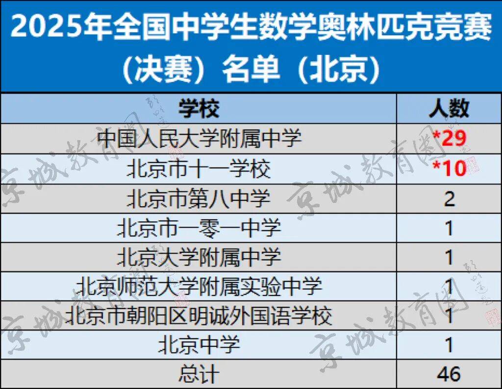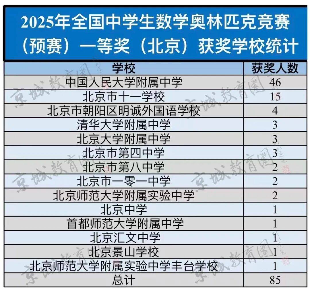 根据官方数据,北京5区14所学校的85名学生获联赛一等奖。来自8所学校的46名学生进入决赛。