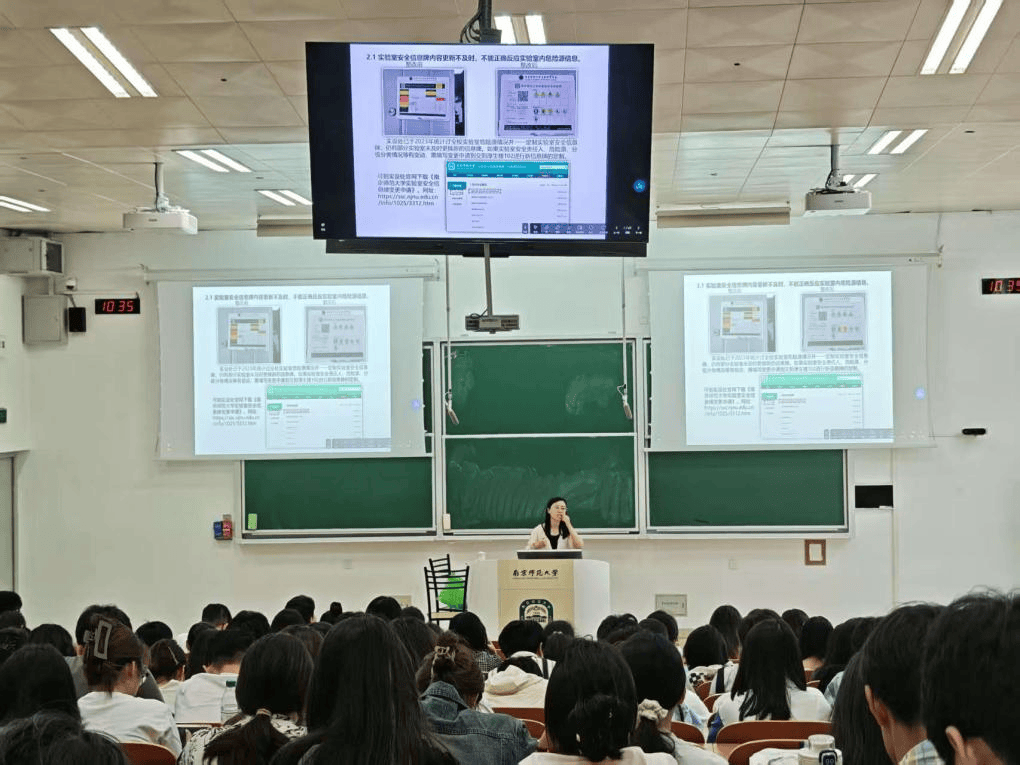 随后,她列举了实验室常见隐患,包括安全通道堵塞、操作不规范、电气设备老化、危险化学品存储不当等,并提出了相应整改措施。接着,毛老师讲解了实验室安全管理的主要内容,涵盖安全培训与准入、实验操作规范、危险化学品全流程管理及应急处理流程,要求学生必须熟知并遵守相关规定。最后,她介绍了南京师范大学实验室综合管理平台的功能与使用方法,该平台支持实验预约、设备管理、安全考核、隐患上报等功能,旨在通过信息化手段提升管理效率与规范性。