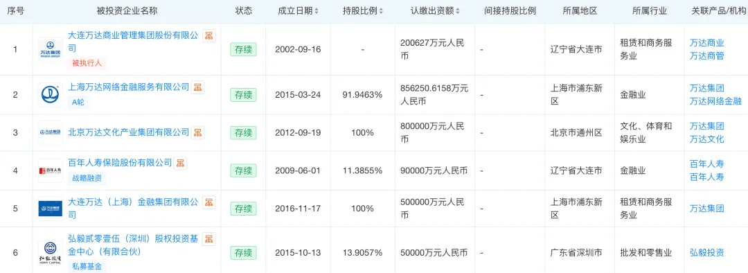另据天眼查,目前万达集团对外投资仍处于存续状态的企业为24家,持股超过50%的为15家,包括上海万达网络金融服务有限公司、北京万达文化产业集团、万达产业文化有限公司等。