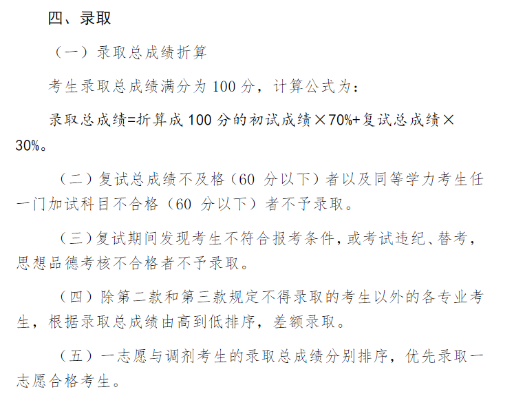 录取总成绩满分为100分,录取总成绩=折算成100分的初试成绩×70%+复试总成绩×30%。