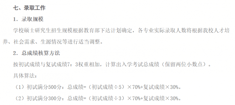 按初试成绩与复试成绩7:3权重相加,计算出入学考试总成绩(保留两位小数点)。也就是说,初试成绩占总成绩的70%!