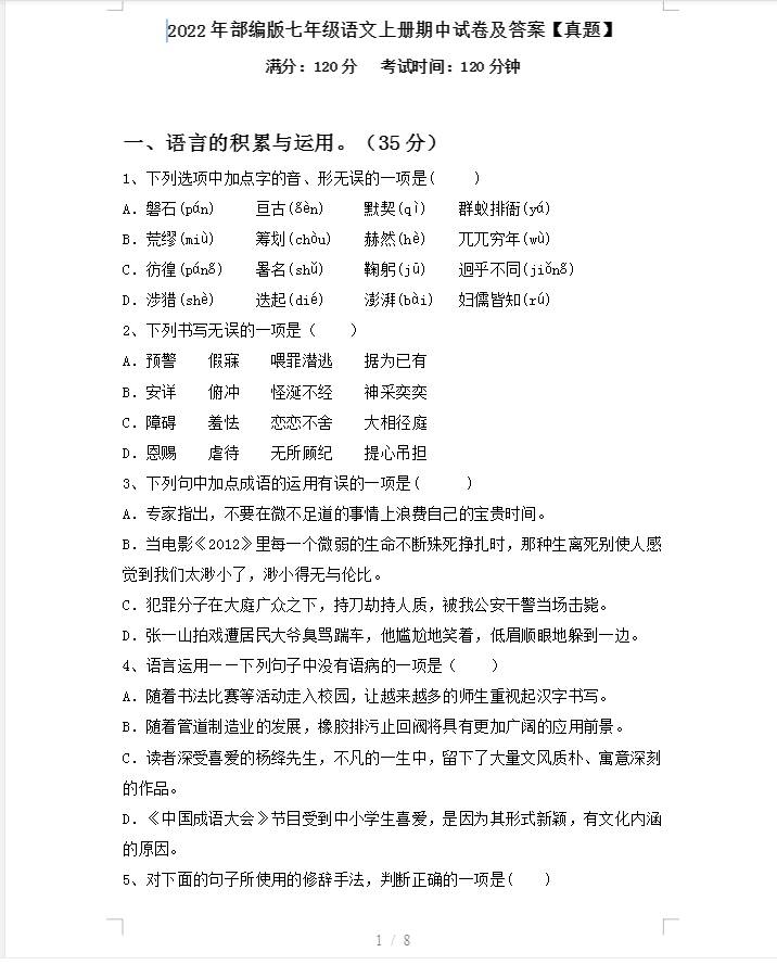 七年级语文在小学基础上进一步深化和拓展,注重培养学生的综合语文素养和自主学习能力。以下是其主要知识点: