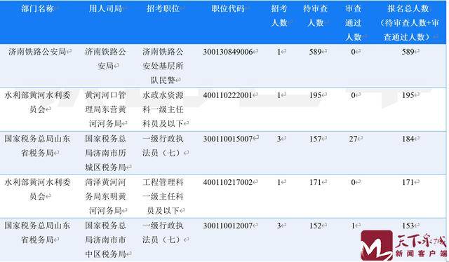 目前,涉鲁职位报名总人数排名前五的职位主要集中在3个部门,分别是济南铁路公安局、水利部黄河水利委员会、国家税务总局山东省税务局。郭旭分析这5个岗位报名人数较多的原因:一是专业方面,这5个岗位面向的要么是一些可报岗位比较少的专业,比如马克思主义理论、水利工程、设计学等,对于这些专业的考生来说想留在山东省内的话选择余地比较少,导致大家扎堆报考;要么是比较热门的专业,比如法学、软件工程等专业,符合条件的考生较多。二是岗位工作位置,这5个岗位有3个工作地点是在济南,随着济南“强省会”战略推进,省会岗位的竞争热度将持续攀升。三是其他限制条件比较宽松,这5个岗位对政治面貌、基层工作经验以及服务基层项目工作经历都没有严格的限制,在面试阶段也没有专业能力测试的限制。需要说明的是,报名数据仅是报名当日的阶段性统计,这一数字并非最终竞争态势,考生完全无需因此焦虑。