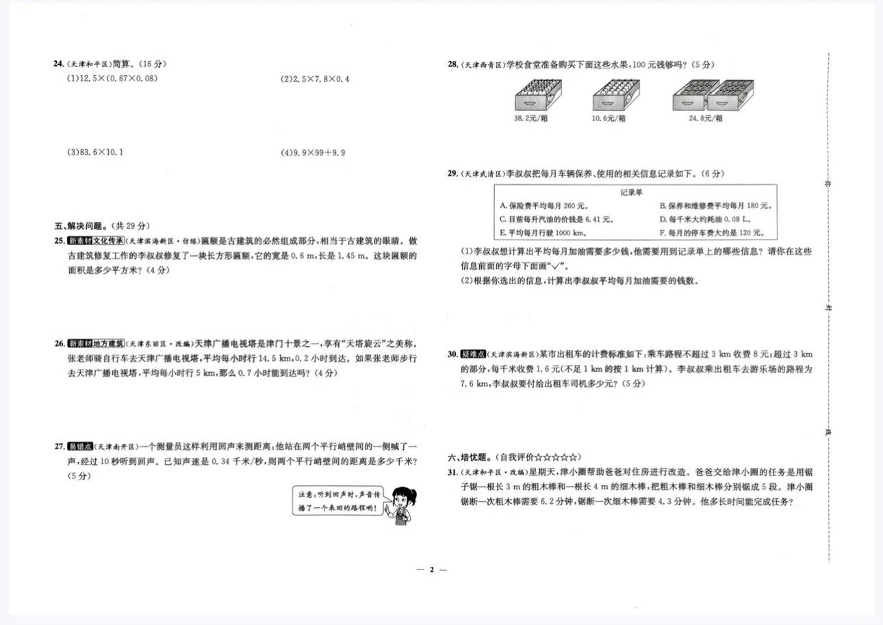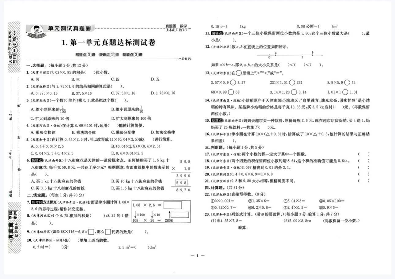 天津五上数学闭眼入!真题圈三步练太香了 家有五年级娃的天津妈妈,别瞎买教辅了!这套2025秋《真题圈》直接对标本地考点,人教版适配度拉满 核心亮点就是“三步练”: 1. 单元卷:吃透小数乘法、简易方程这些基础考点,学完就测超及时 2. 综合卷:专攻多边形面积、植树问题等易错难点,精准踩分 3. 押题卷:汇总天津名校高频考题,考前模拟心里有底 每张卷子都标着易错点、疑难点,答案解析超详细,家长辅导不用费嘴皮子。扫码还能领历年真卷,本地考什么就练什么,比盲目刷题高效10倍! 五年级是数学爬坡关键期,用对真题卷真的能省超多力~ 期末想稳拿高分的赶紧安排!