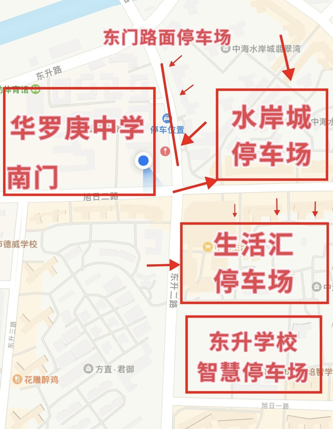 如开车前来,请将车辆停在东门路面停车场、中海生活汇停车场、东升学校智慧停车场、市政停车格子。