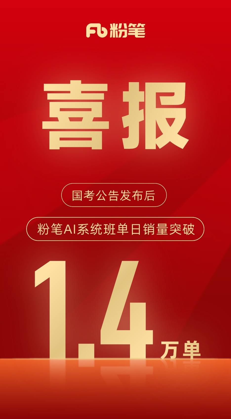 本报讯 (记者袁传玺)10月16日,国内职业教育赛道头部企业粉笔宣布,旗下AI刷题系统班在国考报名公告发布后迅速引发市场强烈反响,单日销量突破14000单。从市场表现来看,以AI大模型为核心技术的,高效、精准、个性化的智能备考方案正成为考生新宠。