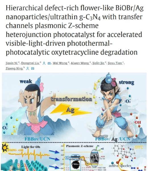 该研究发现通过构建富含缺陷的花状 BiOBr 与 Ag 纳米颗粒和超薄 g-C3N4 组成的等离子体 Z 型异质结,在 60 分钟内实现了 91.7% 的土霉素降解率和 56.2% 的矿化率,且具有优异的可重复使用性和稳定性。作者用葫芦娃的形态变化,展现 Ag 纳米颗粒的作用效果。