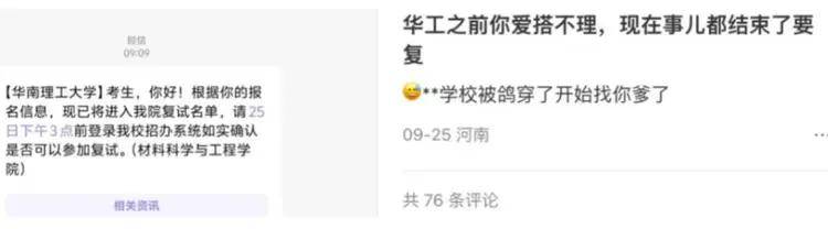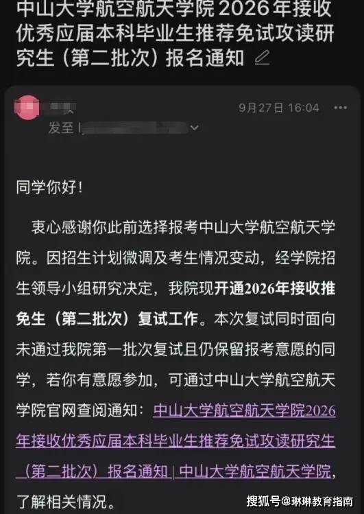 中山大学的航空航天学院由于招生计划微调、再加上大量考生放弃,导致推免名额出现空缺,已经开始从复试落选的学生中找愿意“回心转意”的学生了,这种打脸的操作若非实属无奈相信也没有哪个学校愿意做。