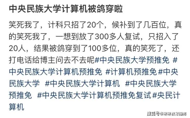 翻阅网上关于“保研被鸽”院校的消息,榜上有名的还有东南大学、山东大学、中央民族大学、武大、南开等等,都是优质名校,其中情况比较惨烈的是中央民族大学,计算机推免被鸽了100多个名额,最终只招到了20多人。