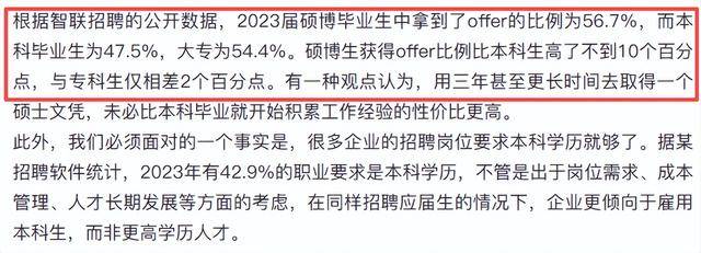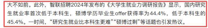 可到了2024年,国内研究生就业率首次低于本科生,硕博学历毕业生offer获得率为44.4%,低于本科生的45.4%,甚至还没有大专生高。