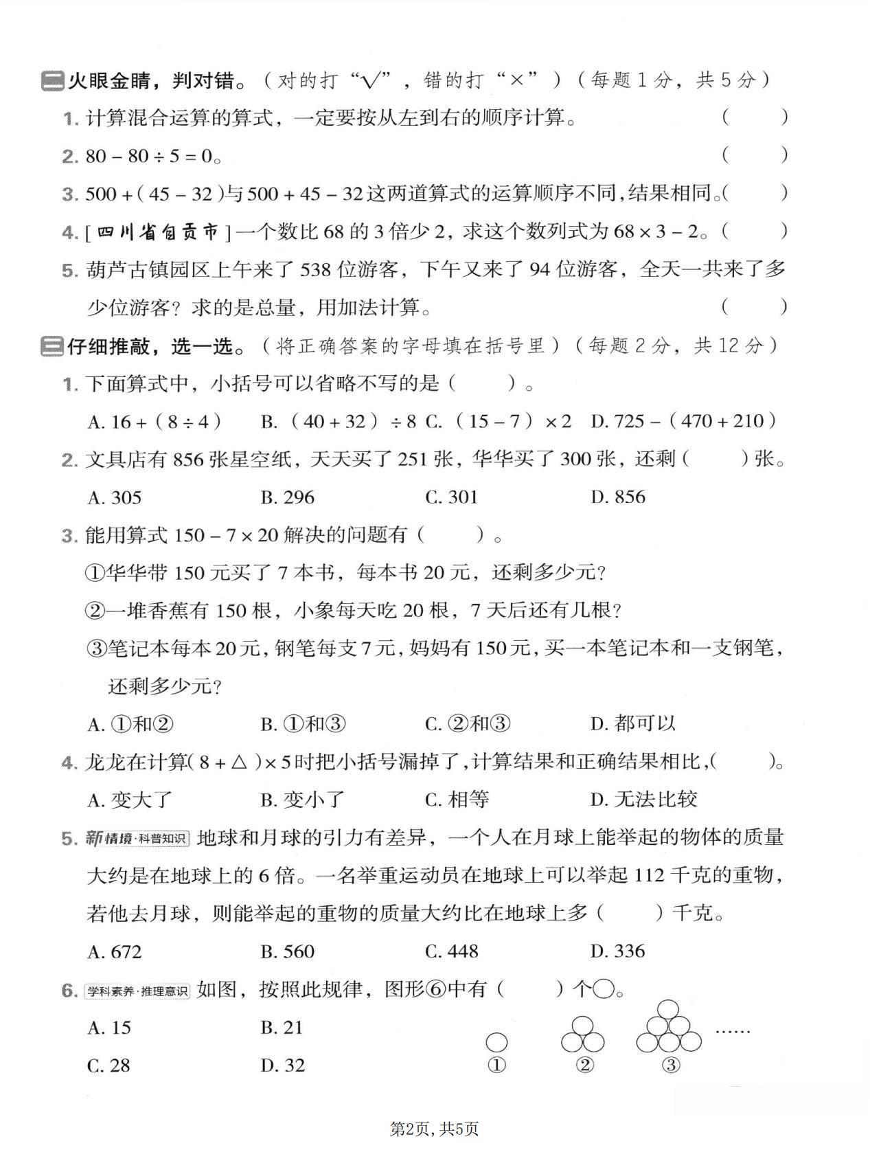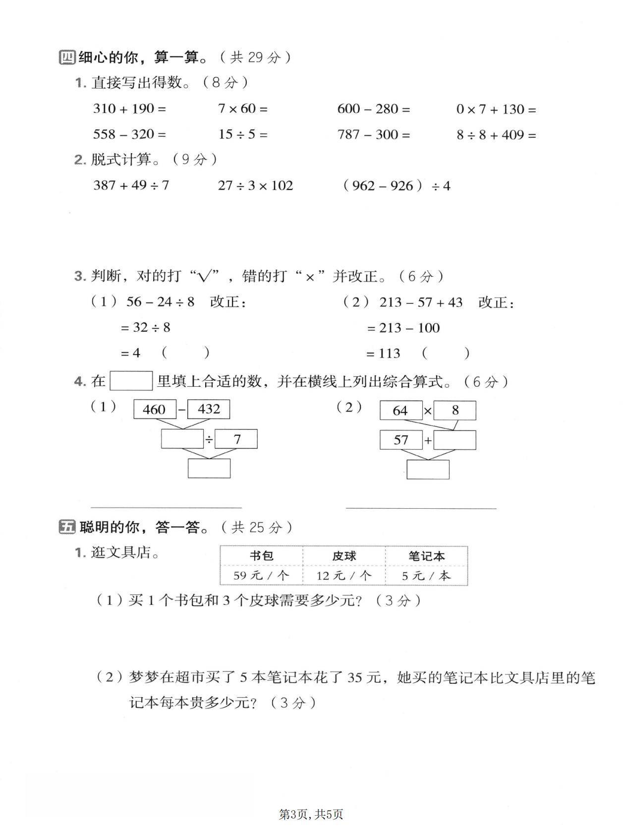 它能全面检测学生对第三单元知识的掌握情况,让学生清楚自己在运算、规律探索、实际应用等方面的优势与不足,便于有针对性地进行复习和巩固。其次,多样的题目类型能激发学生的学习兴趣,避免单一练习带来的枯燥感,使学生更积极地参与到数学学习中。通过解决这些实际问题和有挑战性的题目,学生能提升自己的数学思维能力和解决问题的能力,为后续更复杂的数学学习打下坚实的基础。