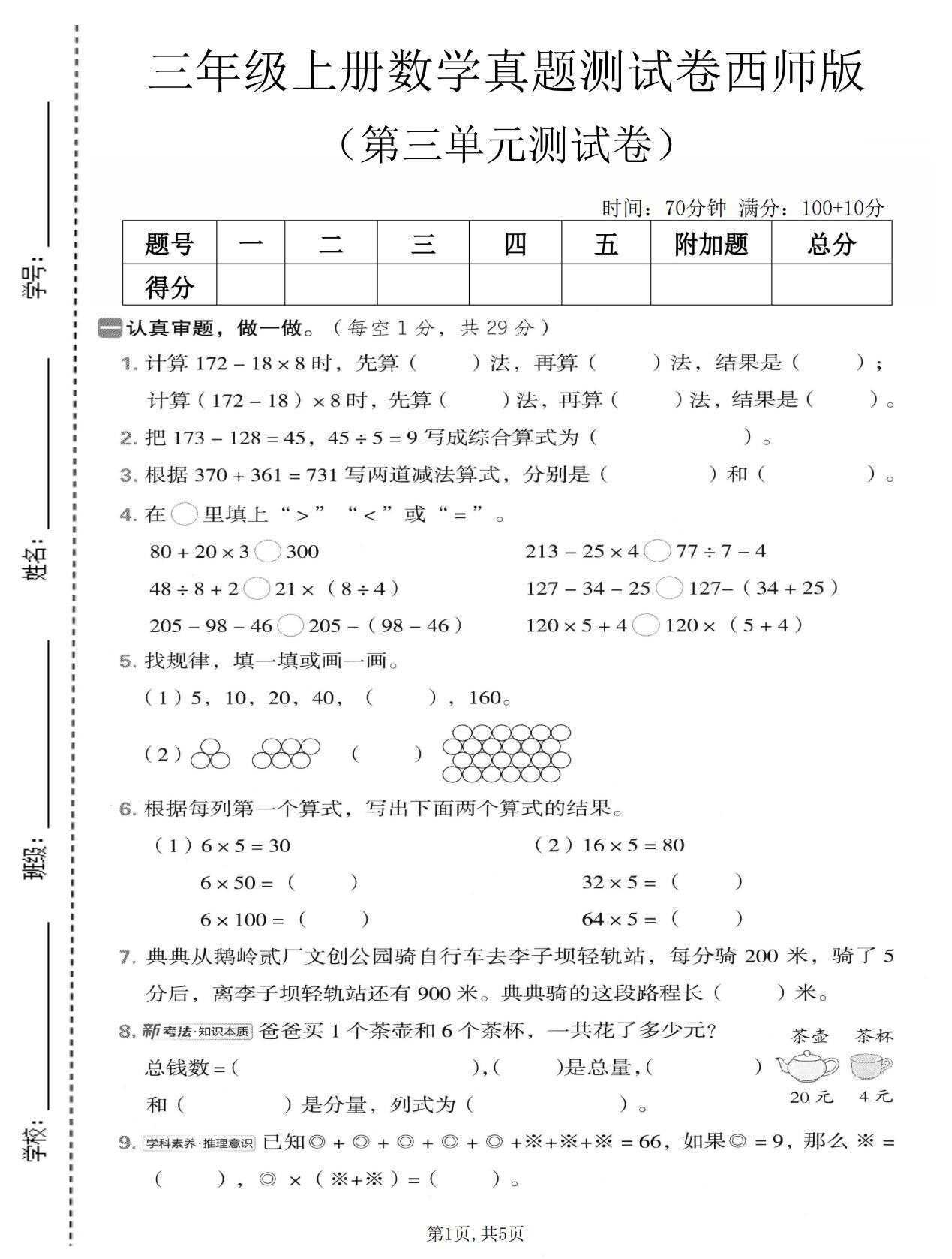 今天为大家分享:三年级(上)西师版数学第三单元真题测试卷1,数的大小比较题目,需要学生准确计算两边式子的结果再进行判断,锻炼了学生的计算和分析能力。找规律的题目,无论是数字规律还是图形规律,都能培养学生的观察能力和逻辑思维能力,让学生学会从已知的数或图形中发现模式并进行推理。实际应用部分,像行程问题、购物问题等,将数学知识与生活场景相结合,使学生学会运用所学的数学知识解决实际生活中的问题,增强了数学的应用意识。
