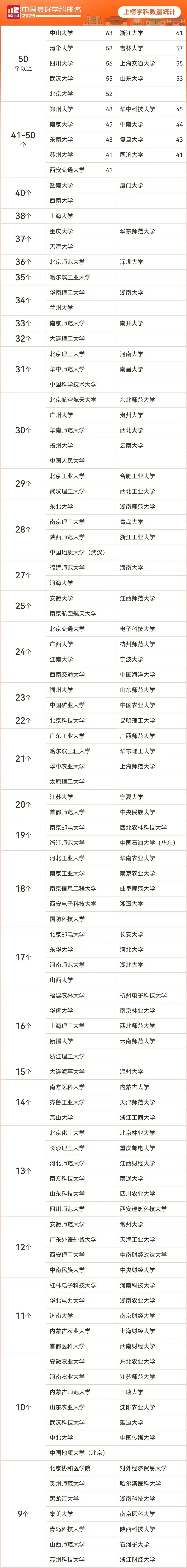 按照上榜学科数量统计,中山大学和浙江大学分别有63个和61个学科上榜,名列前茅,清华大学紧随其后,有58个学科上榜,吉林大学和四川大学以57个和56个上榜学科分列第四与第五名,上海交通大学和武汉大学各有55个学科上榜,山东大学有53个学科上榜,北京大学则有52个学科上榜。非“双一流”高校中,深圳大学上榜学科数最多,共上榜36个学科,广州大学、扬州大学各有30个上榜学科,在非“双一流”高校中并列第二。青岛大学、浙江工业大学、福建师范大学、江西师范大学、杭州师范大学、山东师范大学、昆明理工大学、广东工业大学、广西师范大学、上海师范大学、江苏大学的上榜学科数也都达到20个或以上。