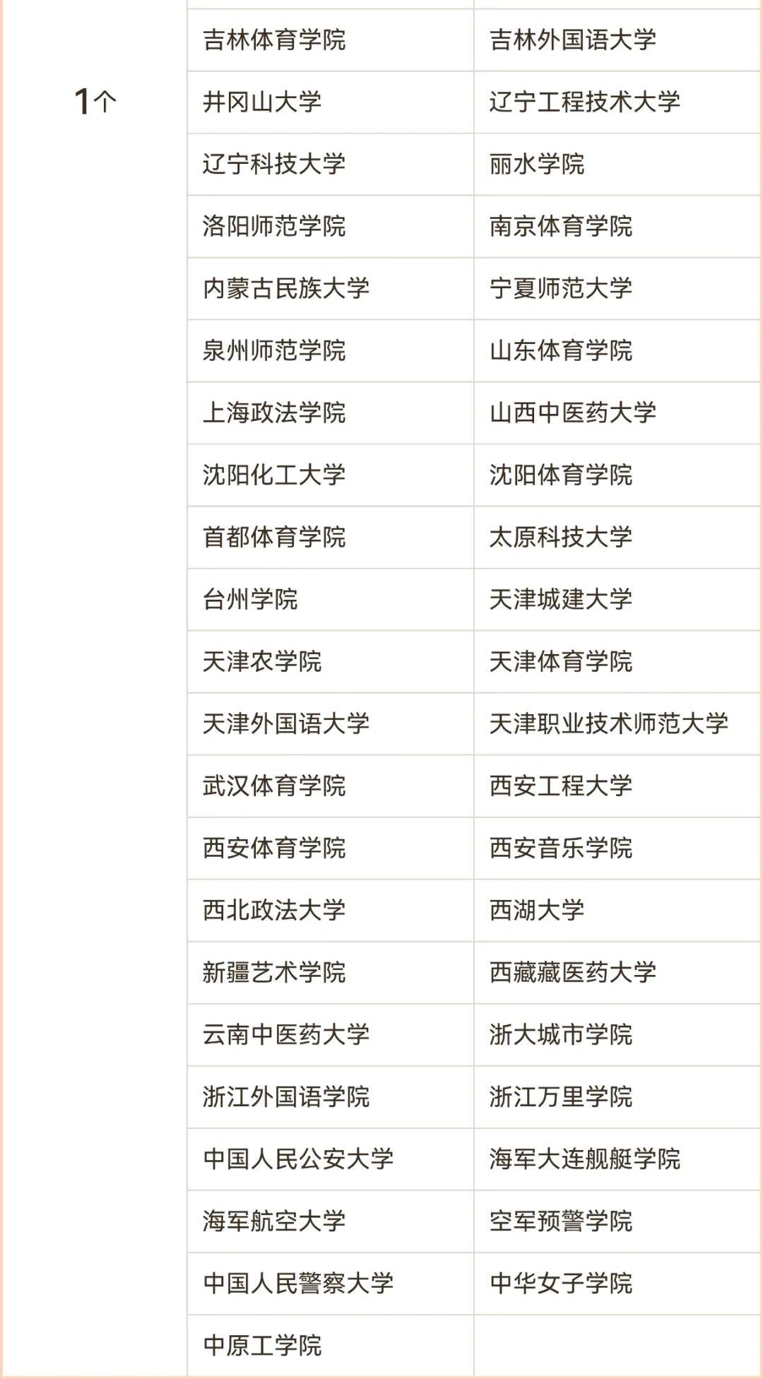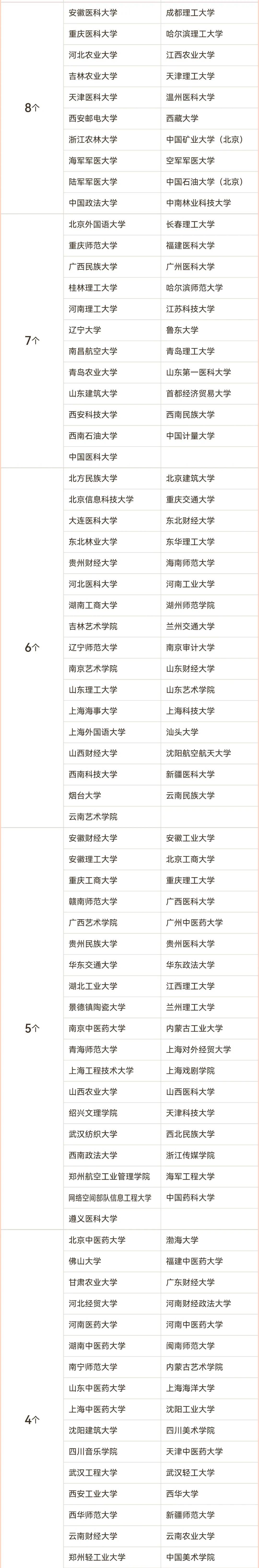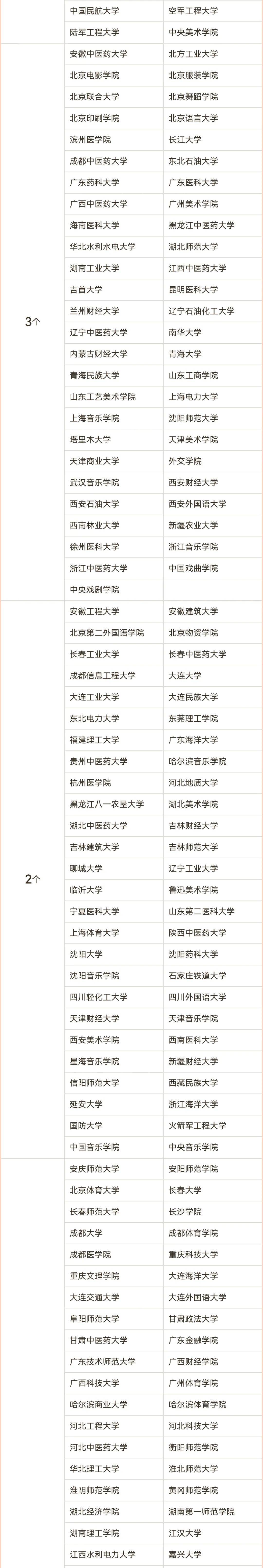 一批非“双一流”高校凭借其在特色领域的突出表现,也有学科进入中国顶尖行列。上海戏剧学院有2个顶尖学科,北京舞蹈学院、北京语言大学、广东外语外贸大学、广州美术学院、华东政法大学、南方医科大学、南京工业大学、南京艺术学院、山西医科大学、四川美术学院、西南政法大学、浙江工商大学、浙江理工大学、浙江师范大学、浙江音乐学院、中国戏曲学院、中南民族大学这17所高校各有1个顶尖学科。