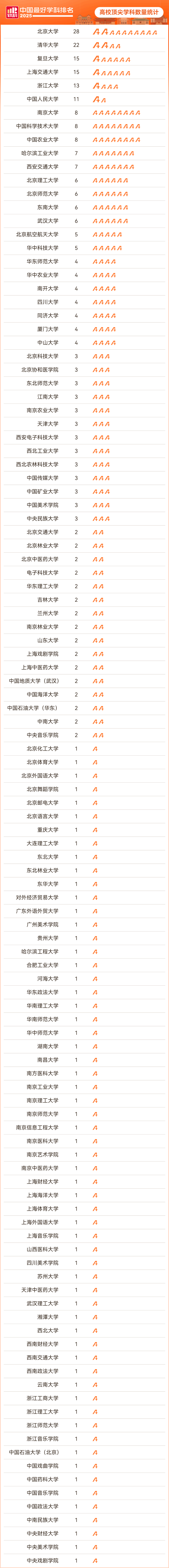根据统计,共有114所大学的336个学科点入选中国顶尖学科。北京大学、清华大学分别以28个和22个中国顶尖学科位列全国前二,复旦大学与上海交通大学各有15个顶尖学科、并列第三,浙江大学以13个顶尖学科占据第五名,中国人民大学以11个顶尖学科紧随其后。