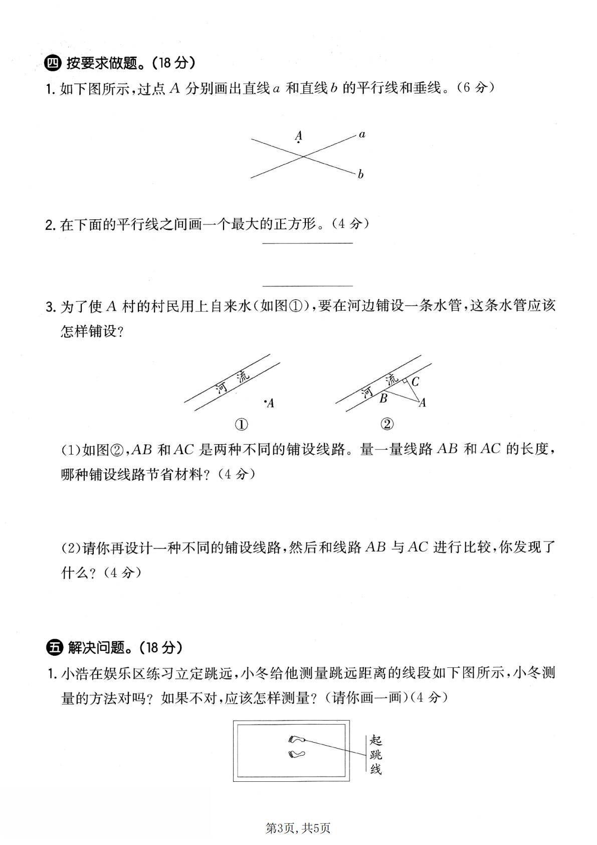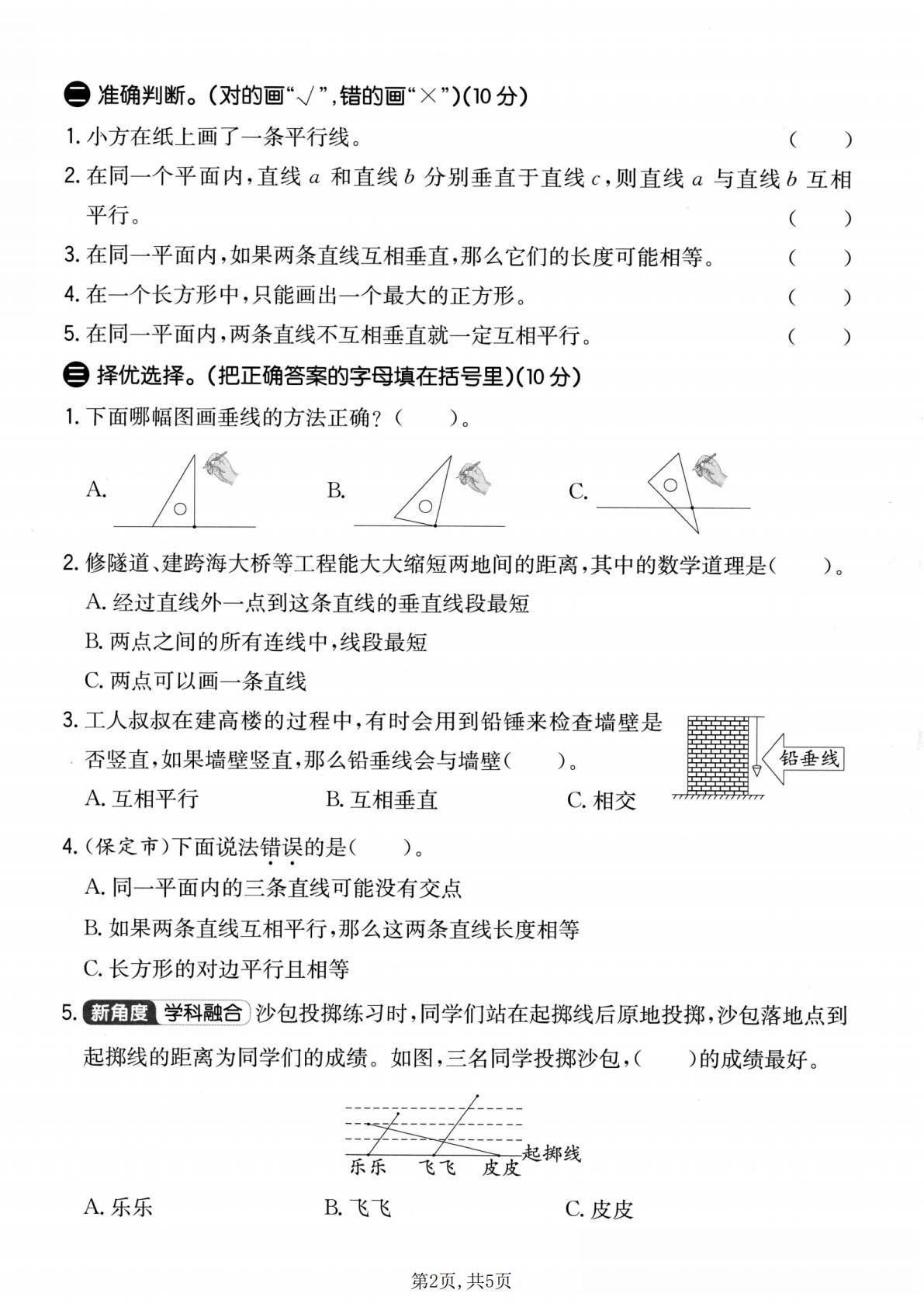 判断部分围绕平行线的定义、同一平面内直线垂直于同一直线的平行关系、垂直直线的长度、长方形中最大正方形数量、同一平面内直线的位置关系展开;选择部分考查画垂线的方法、工程缩短距离的数学道理、铅锤与墙壁的位置关系、直线平行的错误说法、沙包投掷成绩判断;操作部分有过点画平行线和垂线、在平行线间画最大正方形、设计水管铺设线路;解决问题部分结合立定跳远测量考查点到直线的距离知识。