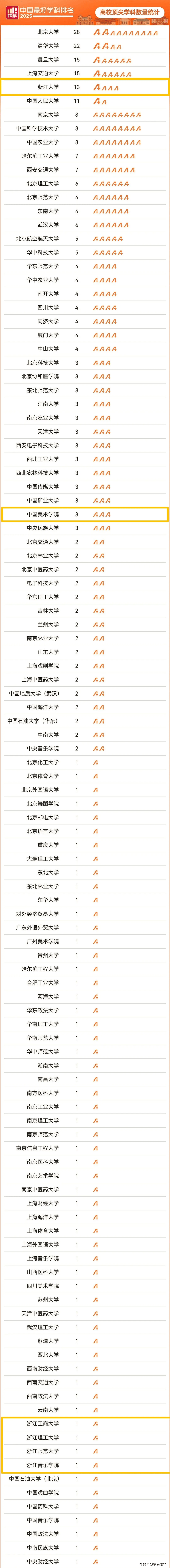 目前全省拥有浙江大学、中国美术学院、宁波大学3所“双一流”建设高校,其中浙江大学作为综合性研究型大学,综合排名长期稳居全国前三,在第五轮学科评估中斩获19个A+学科,形成覆盖文、理、工、医、农的全方位学科优势。