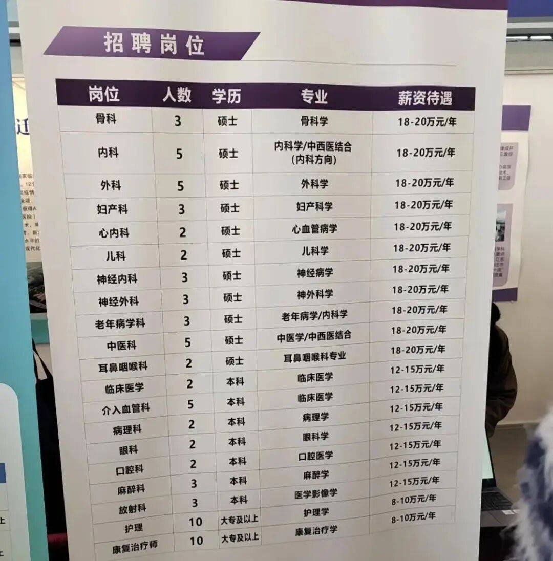 第三家是江苏省某地级市的二甲医院。该医院同样大规模分科室招聘医师,这里面主要科室是需要应聘者拥有硕士或以上学位,年薪在18万元到20万元之间。