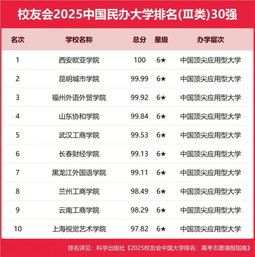 近日,全国第三方大学评价机构艾瑞深校友会网正式发布《2025中国大学排名》,其中民办大学Ⅲ类榜单聚焦艺术、体育、经济、管理、医学等学科领域,西安欧亚学院、昆明城市学院、福州外语外贸学院位列前三甲,山东协和学院、武汉工商学院紧随其后,形成“一超多强”的竞争格局。