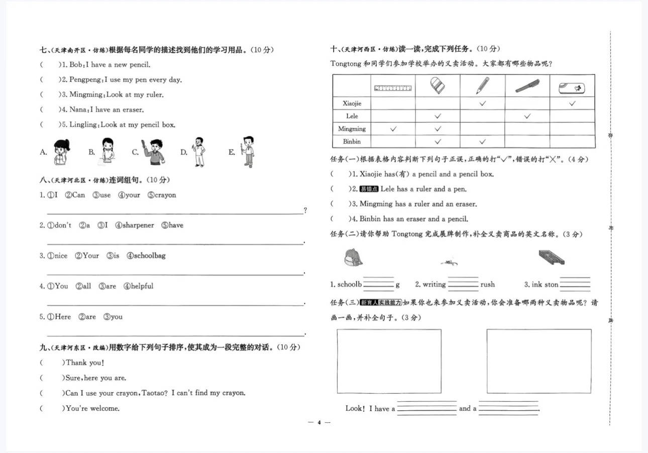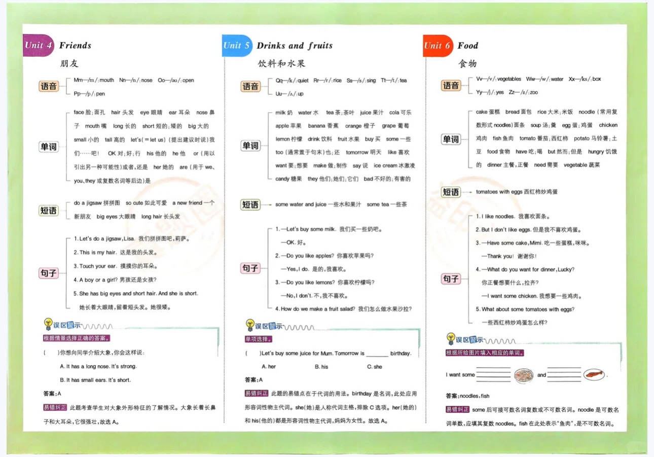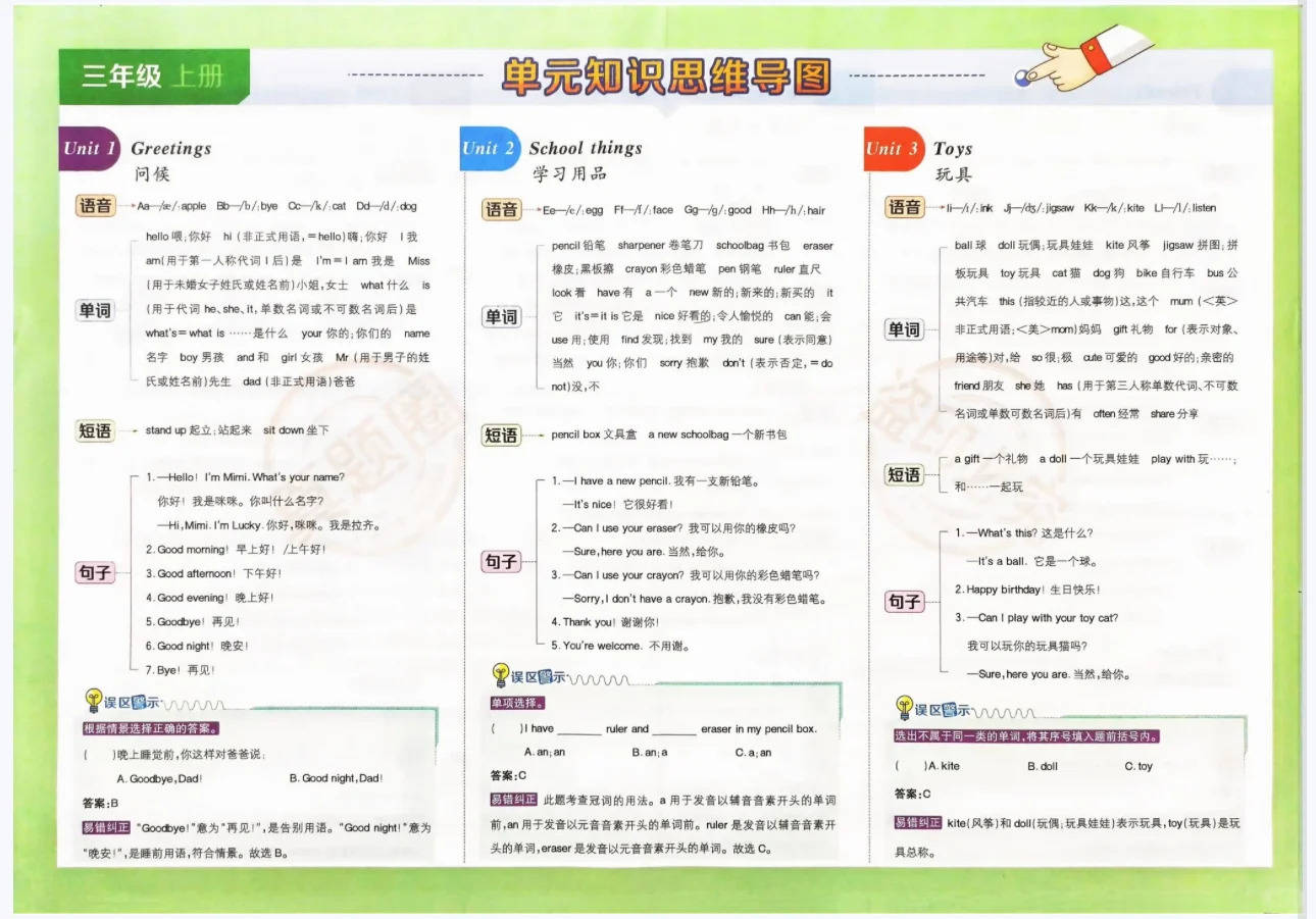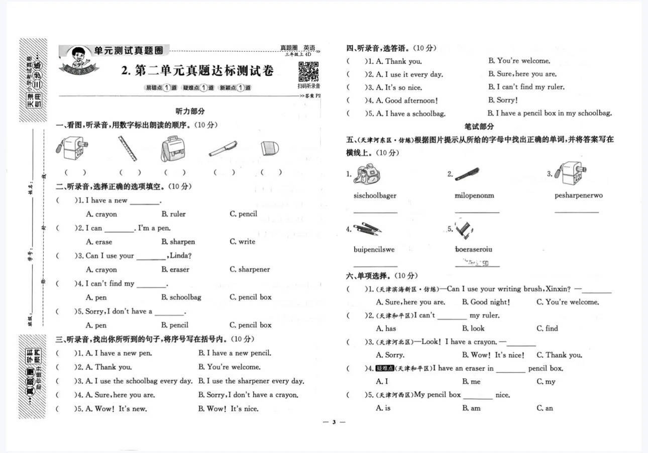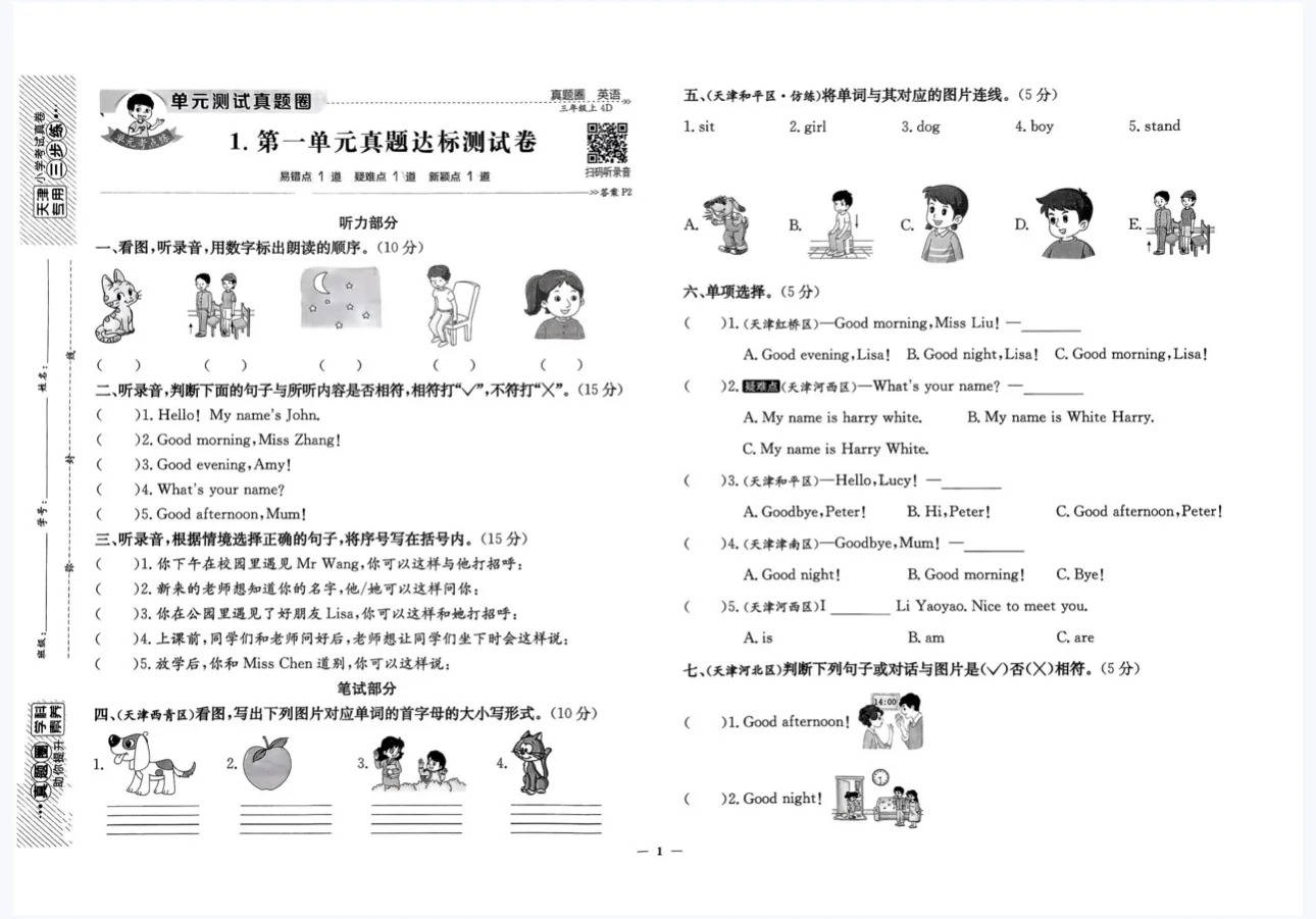 三年级是英语学习打基础、培养兴趣和学习习惯的关键期。单元测试卷能同步检测学习效果,听力部分提升听力理解能力,笔试部分巩固词汇、语法与情景运用。知识思维导图系统梳理各单元重点,让知识脉络更清晰,方便复习记忆,像不同单元的核心单词、常用对话,一目了然,帮助学生构建知识体系。《真题圈》则提供天津本地考试真卷,让学生熟悉考试题型与难度,提前适应考试节奏,了解命题趋势。无论是日常学习中夯实基础,还是备考时冲刺提分,这份资料都能全方位助力三年级学生提升英语能力,是三年级上册英语学习的绝佳好帮手~