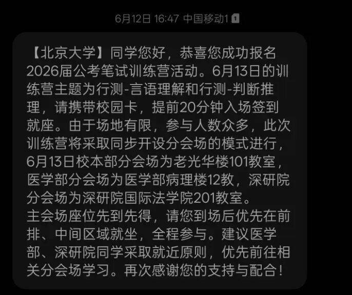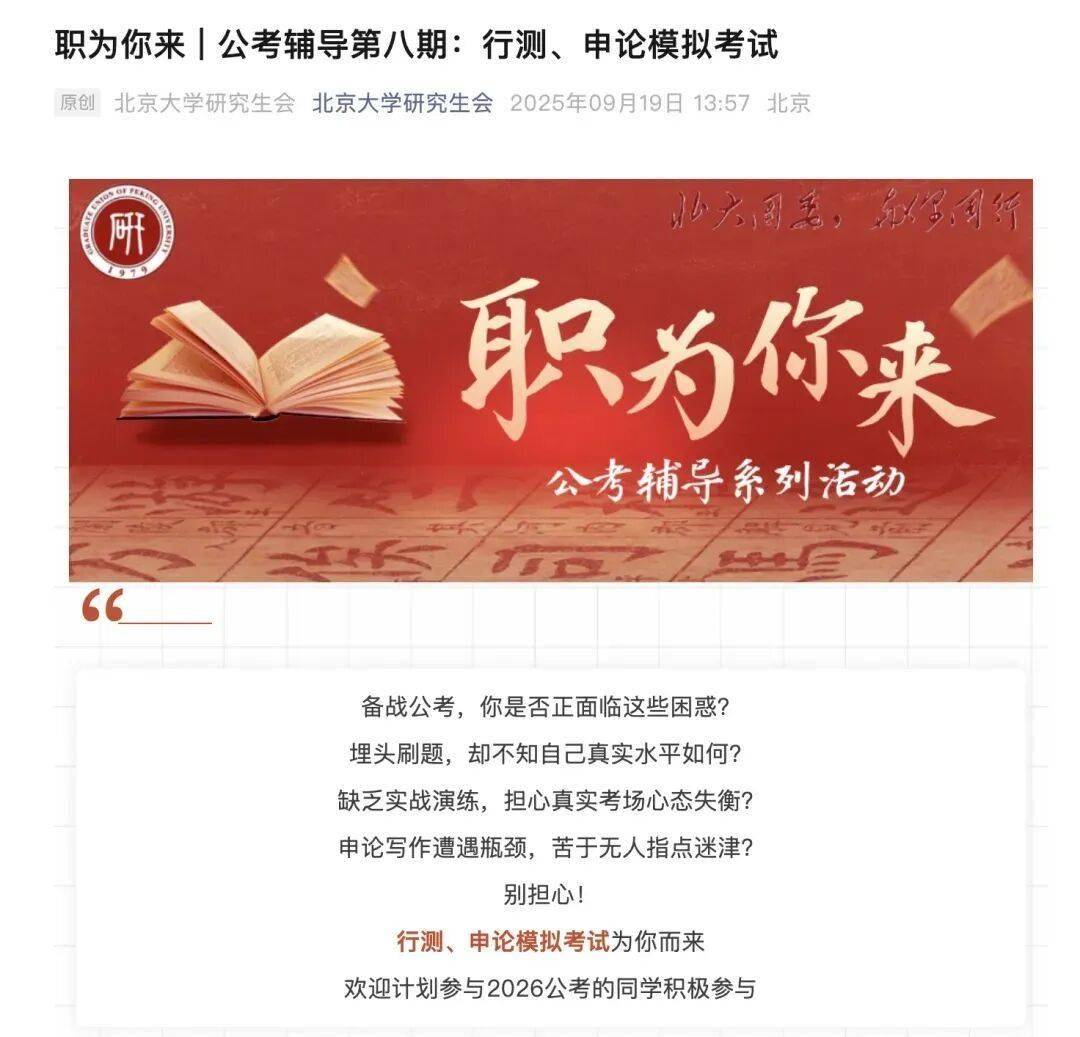 以北大的公务员模考为例,其属于北大“公考辅导系列”就业品牌活动,北大研究生会担任主办方之一。9月19日,北大研究生会微信公众号发布推文《公考辅导第八期:行测、申论模拟考试》。2024年,北大研究生会也曾开展6次线下模考。