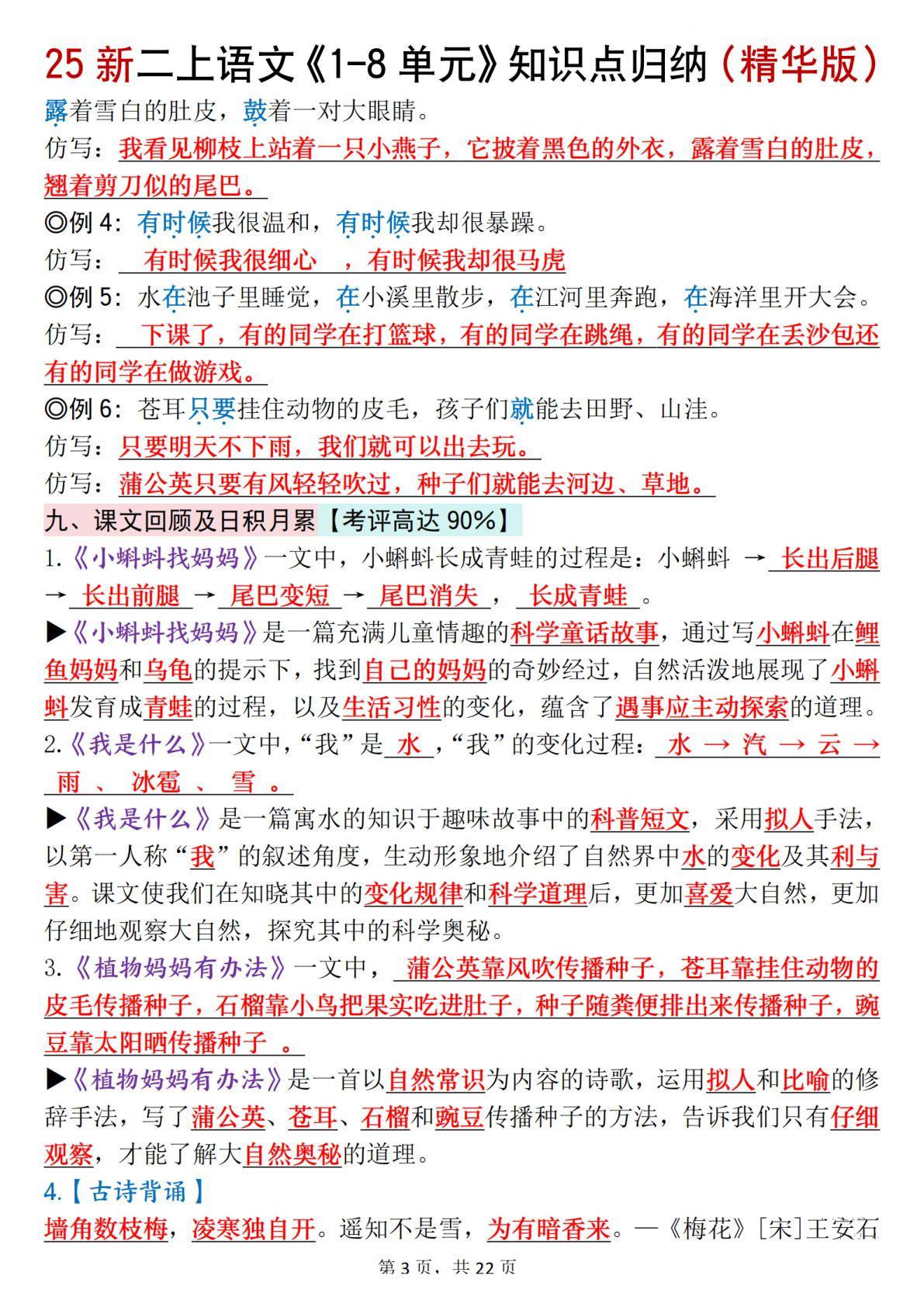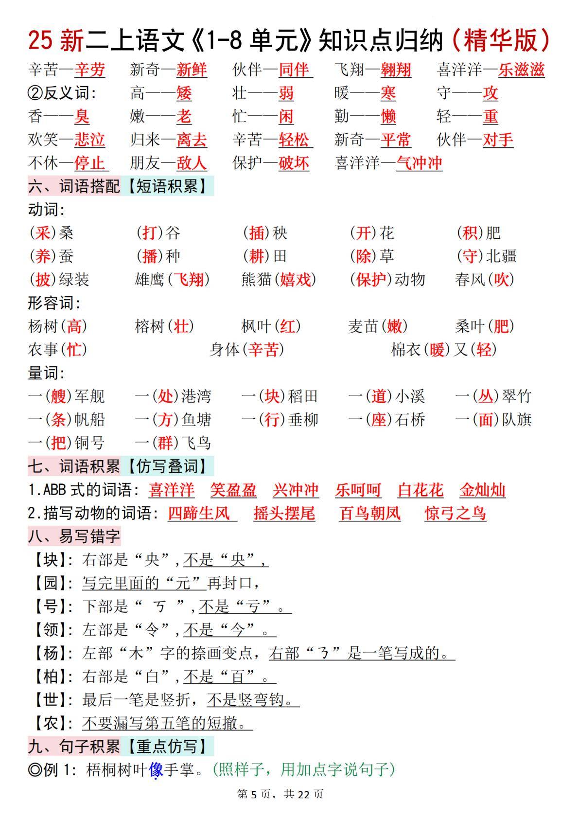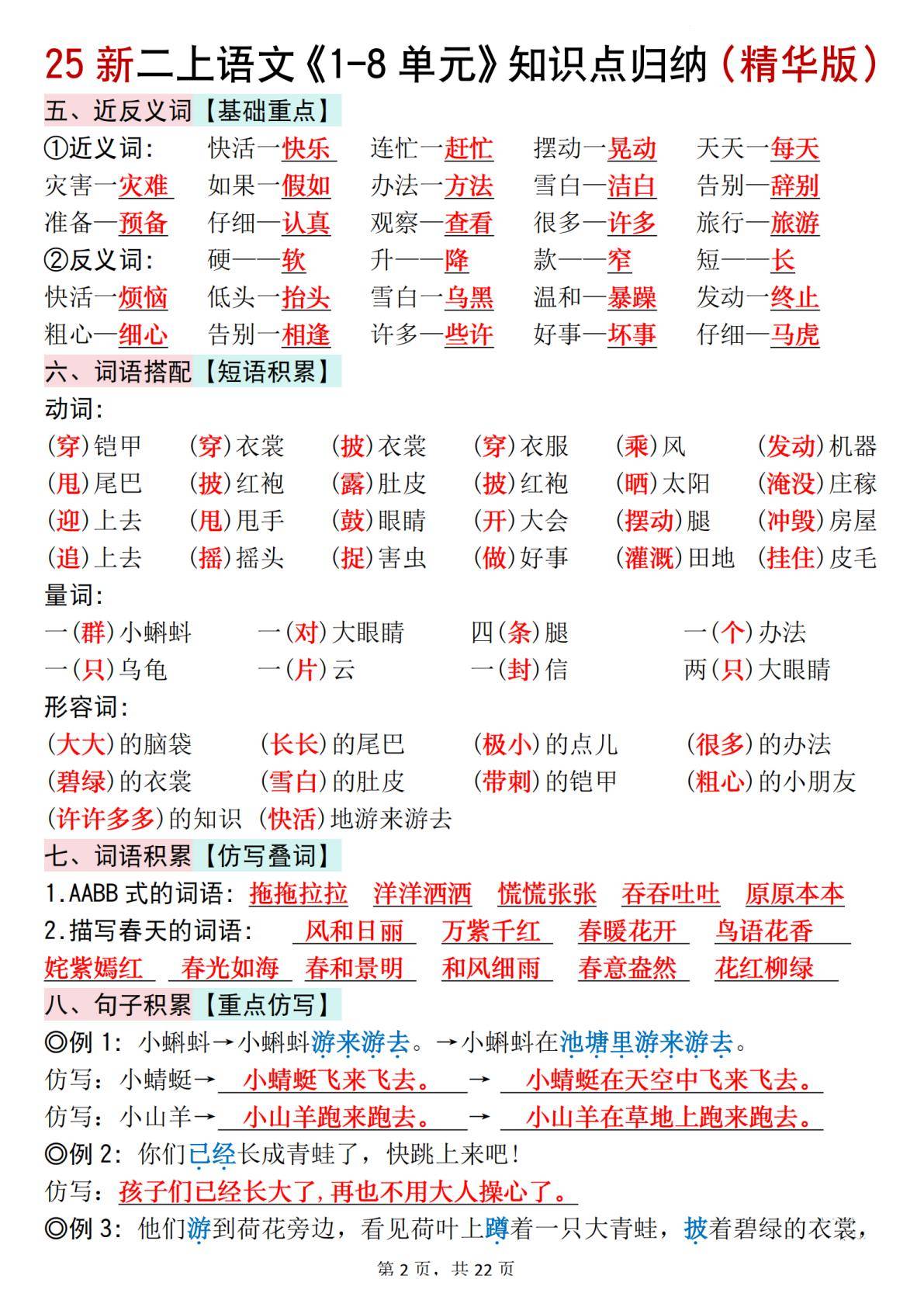 今天为大家分享:1016【25新二上语文1-8单元知识点汇总(精华版)九大考点22页,从涵盖的内容来看,包含了词语听写、易错字音、形近字、多音字、近反义词、词语搭配、词语积累、句子积累以及课文回顾和日积月累等多个方面。在词语方面,词语听写列出了一类字和词语表中的重点词语,帮助学生巩固生字词的书写与记忆;易错字音针对二类字的认读,标注了容易读错的字音,能让学生准确掌握汉字的读音。
