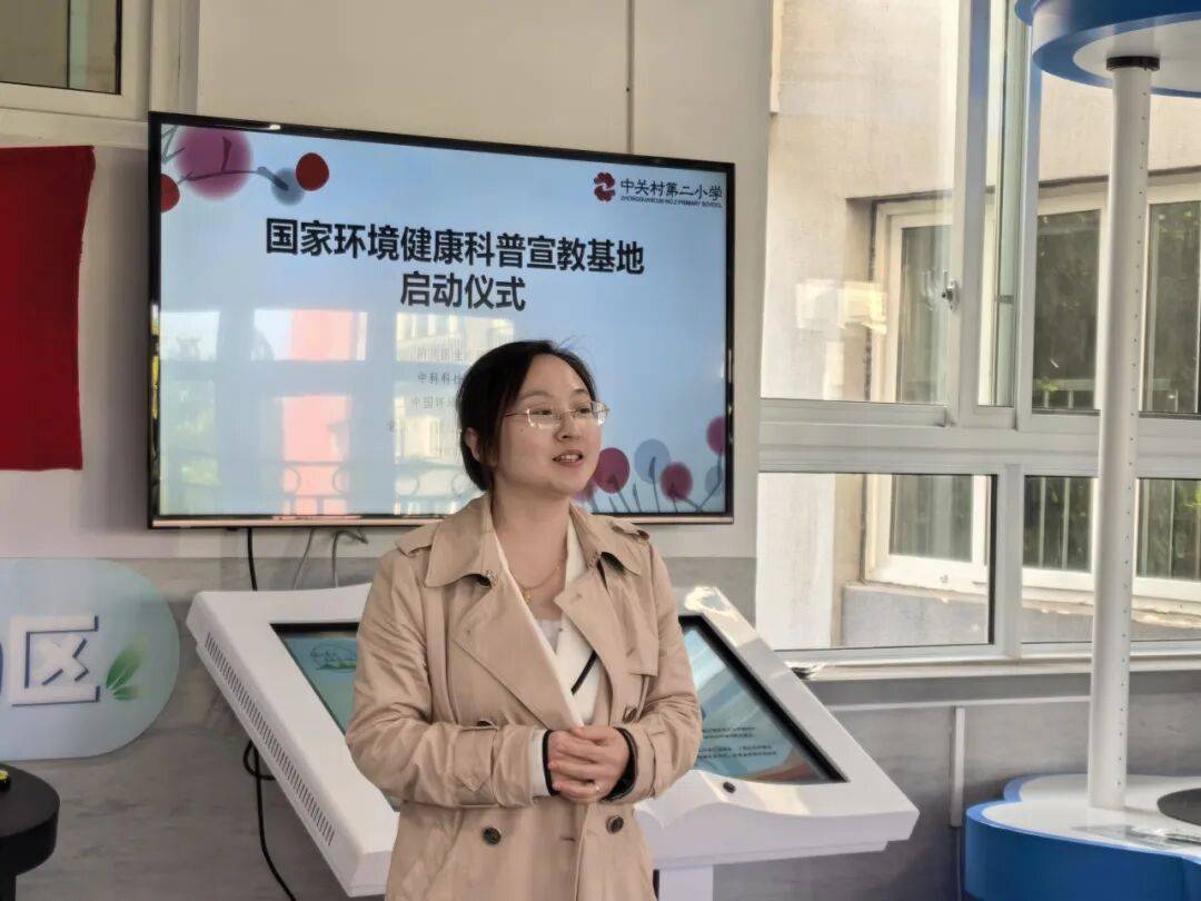 仪式现场,中关村第二小学教师发展中心副主任郝新怡首先发言,详细分享学校在环境科技领域的教学实践与特色活动,展现了学校深耕生态教育的扎实基础与丰富经验。随后,余建科介绍了海淀区环境健康管理试点的核心工作内容,以及海淀区环境健康科普宣教基地的建设背景与整体规划。齐明锐则分享了中心在生态环境科普领域的过往成果与实践案例。