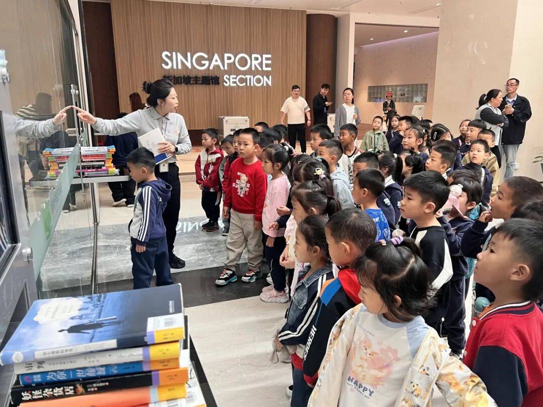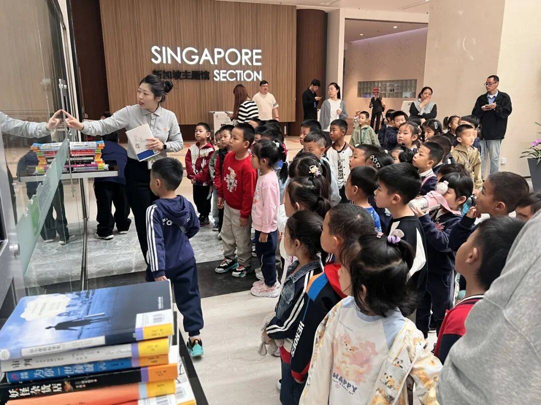 在新加坡主题馆,孩子们的注意力先被地毯上的胡姬花、月季花图案吸引。“这是什么花?”“为什么书里榴莲图片旁还有英文?” 面对一连串提问,工作人员没有直接作答,而是递上双语绘本,让孩子们自己找答案。从对比肉骨茶与家里汤的差别,到跟着标注学“胡姬花”英文发音,孩子们成了主动的“文化发现者”,书籍也成了他们触摸新加坡的 “小窗口”。