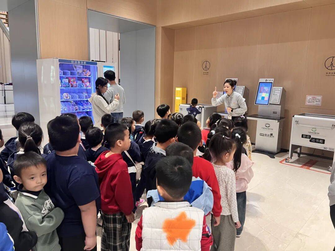 走到智能分拣还书系统前,“大机器人怎么分清书该去哪”的疑问又冒了出来。工作人员干脆请孩子们当“小助手”,递书、看传送带运转、观察图书“跳”进对应格口。“每本书都有身份证条码,机器人靠它找家”的通俗讲解,让抽象的科技变得可感可知。有孩子还蹲在一旁数“机器人”送对了多少书,好奇与探索欲拉满。