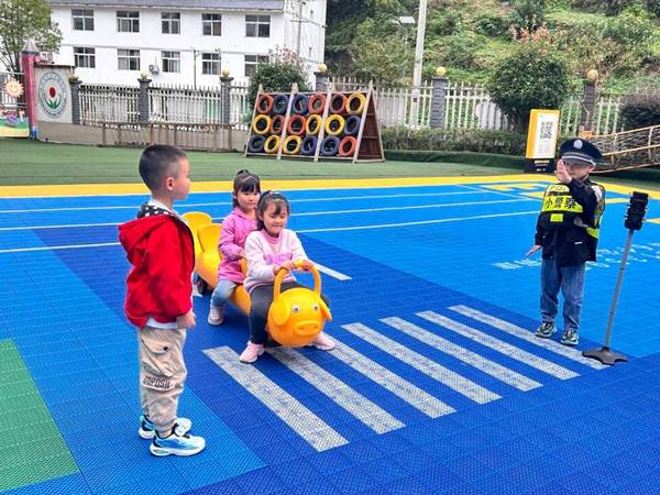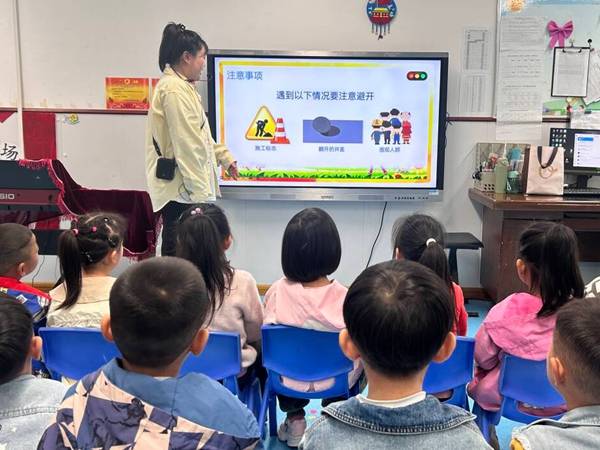 活动将交通安全知识融入趣味互动,让幼儿在轻松氛围中掌握自我保护技能。活动中,老师们通过多元化形式让交通安全知识“活”起来。幼儿跟着朗朗上口的交通安全儿歌,边唱边做动作,快速记住了“红灯停、绿灯行、黄灯亮了等一等”的通行规则;借助色彩鲜明的交通安全标识图片,孩子们认识了禁止通行、注意儿童、人行横道等常见标识;通过情景模拟游戏,幼儿分别扮演“小司机”“行路人”,在互动中学习了乘车系好安全带、不把头手伸出窗外,以及过马路走斑马线、不追逐打闹等安全知识。同时,老师特别强调,遇到特殊情况时可求助身穿制服的警察叔叔,或拨打警察电话110,看到施工标志、路面井盖和人群拥挤等场景,要及时停下脚步、主动避让。