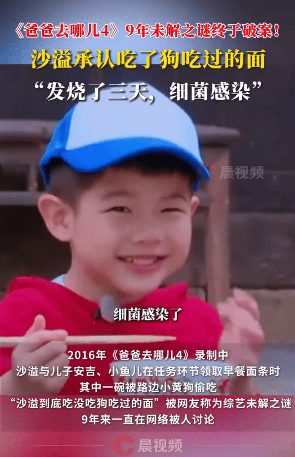 近日,沙溢在某综艺中称,自己曾在另一档节目中,吃了狗吃过的面,并且因此发烧三天。2016年《爸爸去哪儿4》录制中,沙溢与儿子安吉、小鱼儿在任务环节领取早餐面条时,其中一碗被路边小黄狗偷吃,“沙溢到底吃没吃狗吃过的面”被网友称为综艺未解之谜,9年来一直在网络被人讨论。