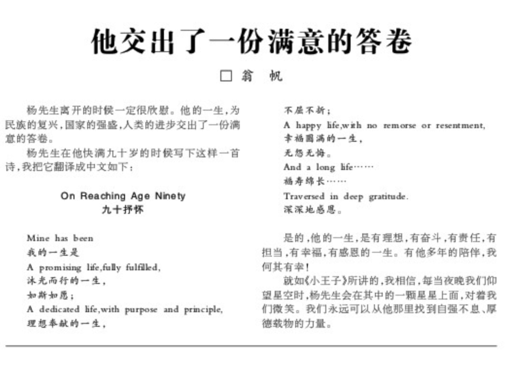 杨先生在他快满九十岁的时候写下这样一首诗,我把它翻译成中文如下: